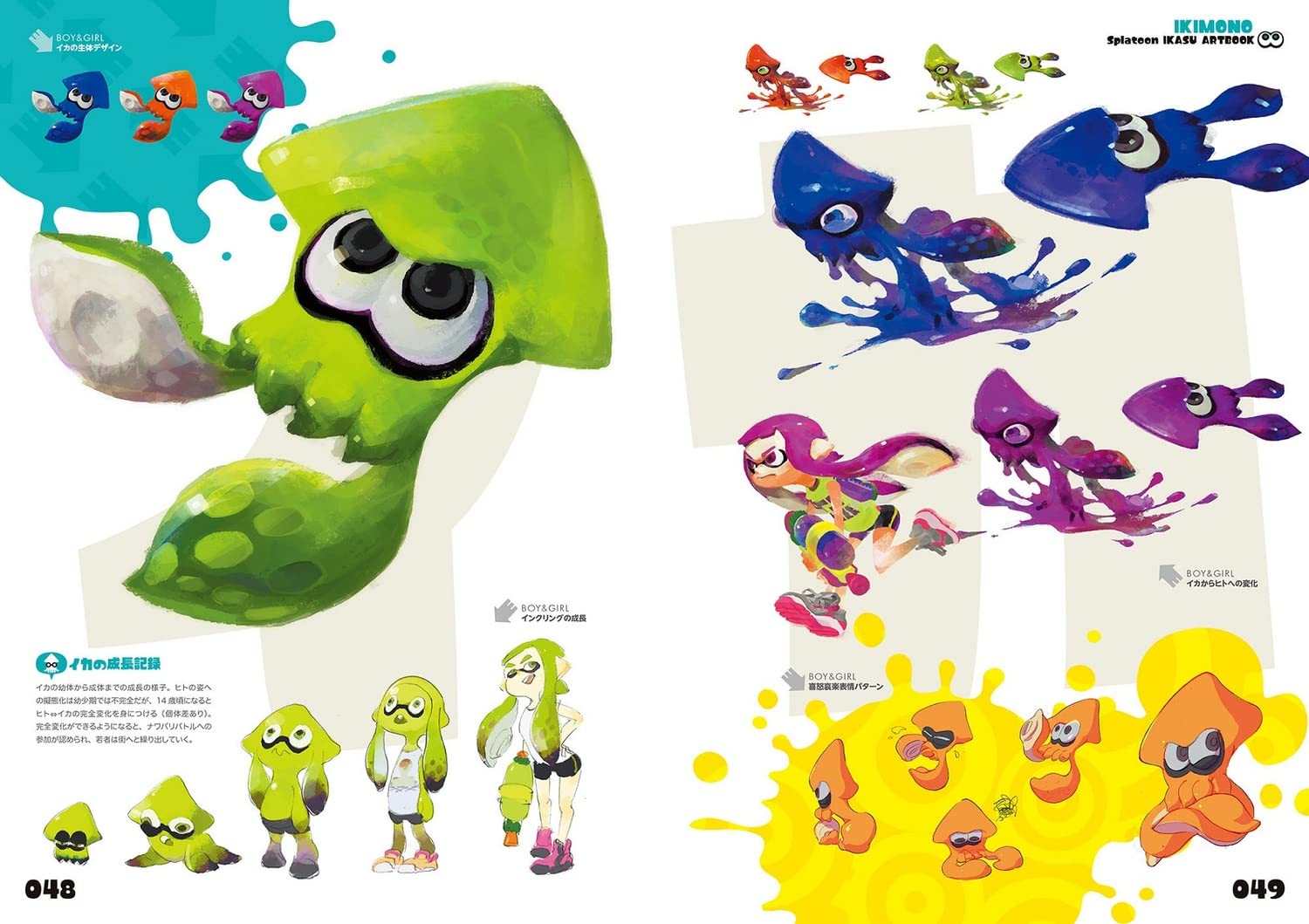 Incluye diseños de personajes (Inklings y Octolings), vestuario (Gear), armas (Buqui), etapas de batalla y arte conceptual del mundo. También contiene ilustraciones clave y storyboards de las secuencias de juego, junto con informes y análisis detallados de los "Investigadores Calamar" (Ika Kenkyūin) que profundizan en la cultura y el lore del mundo.