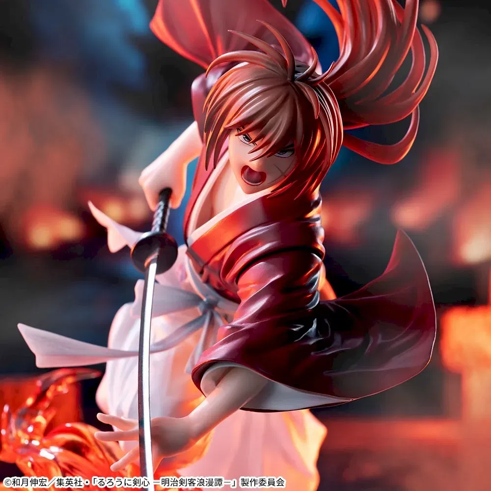 Directo del anime Rurouni Kenshin – Meiji Kenkaku Romantan, llega la primera figura de Himura Kenshin dentro de la línea Luminasta de Sega. Con una altura aproximada de 17 cm, muestra al legendario espadachín en una pose dinámica y cargada de intensidad, con una expresión llena de determinación.