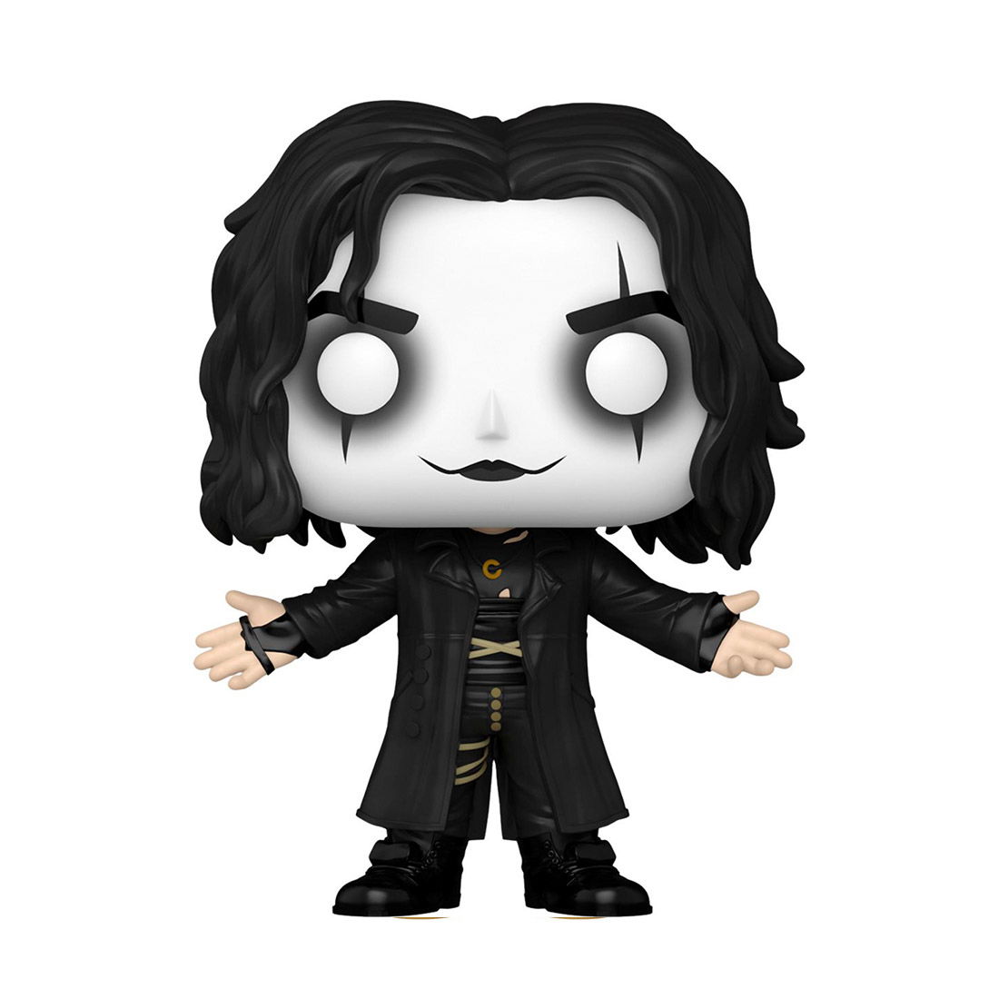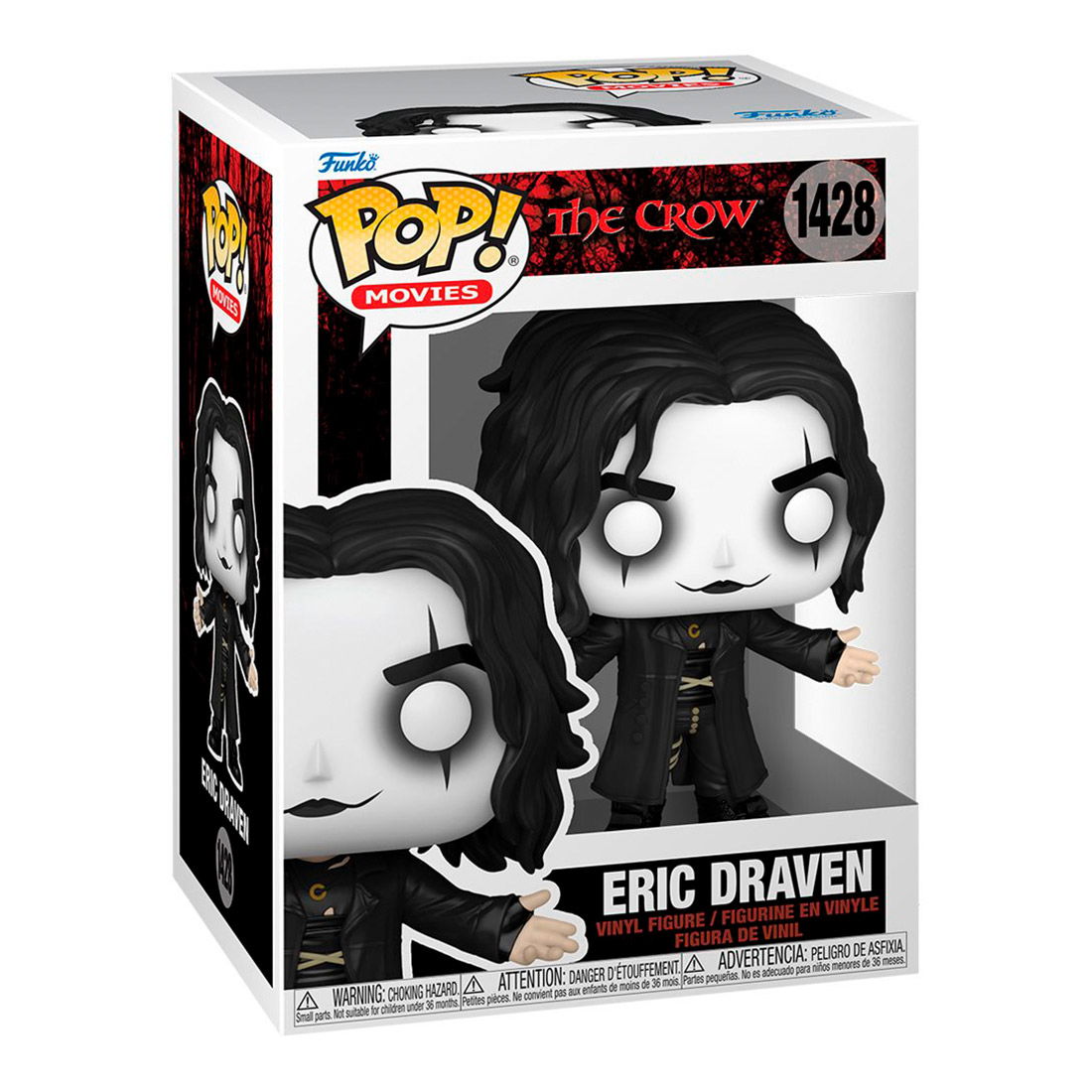 El Funko Pop! #1428 – Eric Draven, inspirado en la película The Crow, muestra al protagonista resucitado con su icónico maquillaje, vestimenta oscura y postura desafiante, fiel al estilo gótico y melancólico del film.