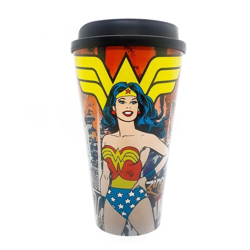 Toma tus bebidas favoritas en un vaso con toda la onda! Este vaso de Wonder Woman™, te permitirá disfrutar de bebidas tanto frías como calientes. El mismo cuenta con tapa a presión, la cual también permite que puedas beber directamente del mismo.